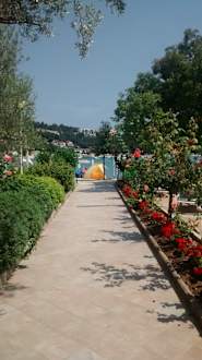 Alles sehr gepflegt. Rosenbüsche und Sommerblumen zieren den Weg zum Strand.