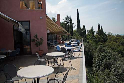 Die Terrasse des Restaurants und der Bar. Mit Blick auf den See und Malcesine.
