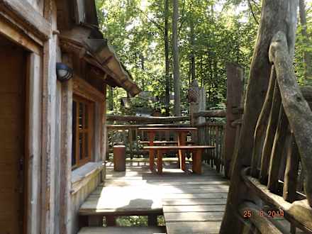 Baumhaus Robinienheim, gemütliche Terrasse mit wunderschöner Aussicht. Hier kann man nach einem Ausflug in den Freizeitpark gut Abendessen und entspannen.