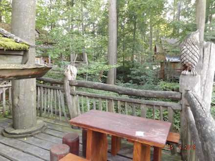 Baumhaus Robinienheim, gemütliche Terrasse mit wunderschöner Aussicht. Hier kann man nach einem Ausflug in den Freizeitpark gut Abendessen und entspannen.