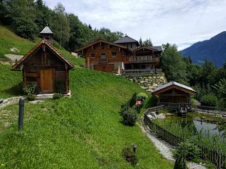 AußenansichtBlick vom Romantikchalet auf den Schwimmteich, die Sauna, die Kapelle und auf den "Adlerhorst" ;-)