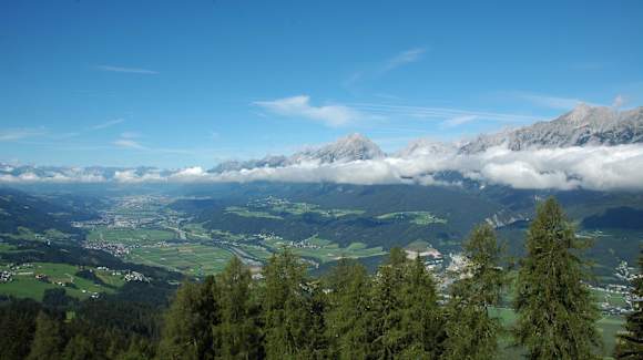 Blick von der HotelterrasseDas Inntal vor Augen wird bei gutem Wetter auf der Terrasse gegessen. Im Hintergrund ist Innsbruck zu sehen.
