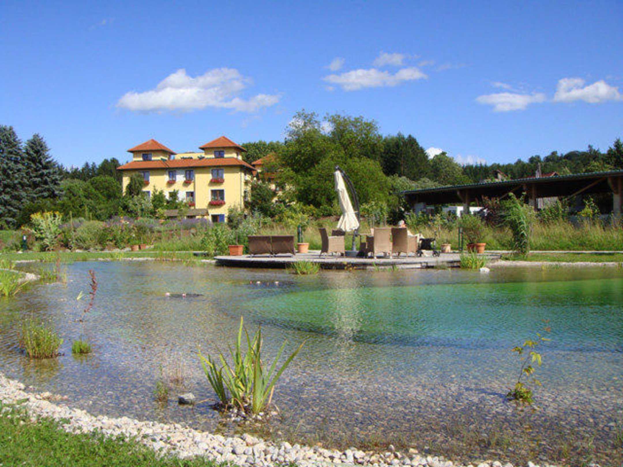 Hotelgebäude mit Blick auf Schwimmbiotop im Vordergrund