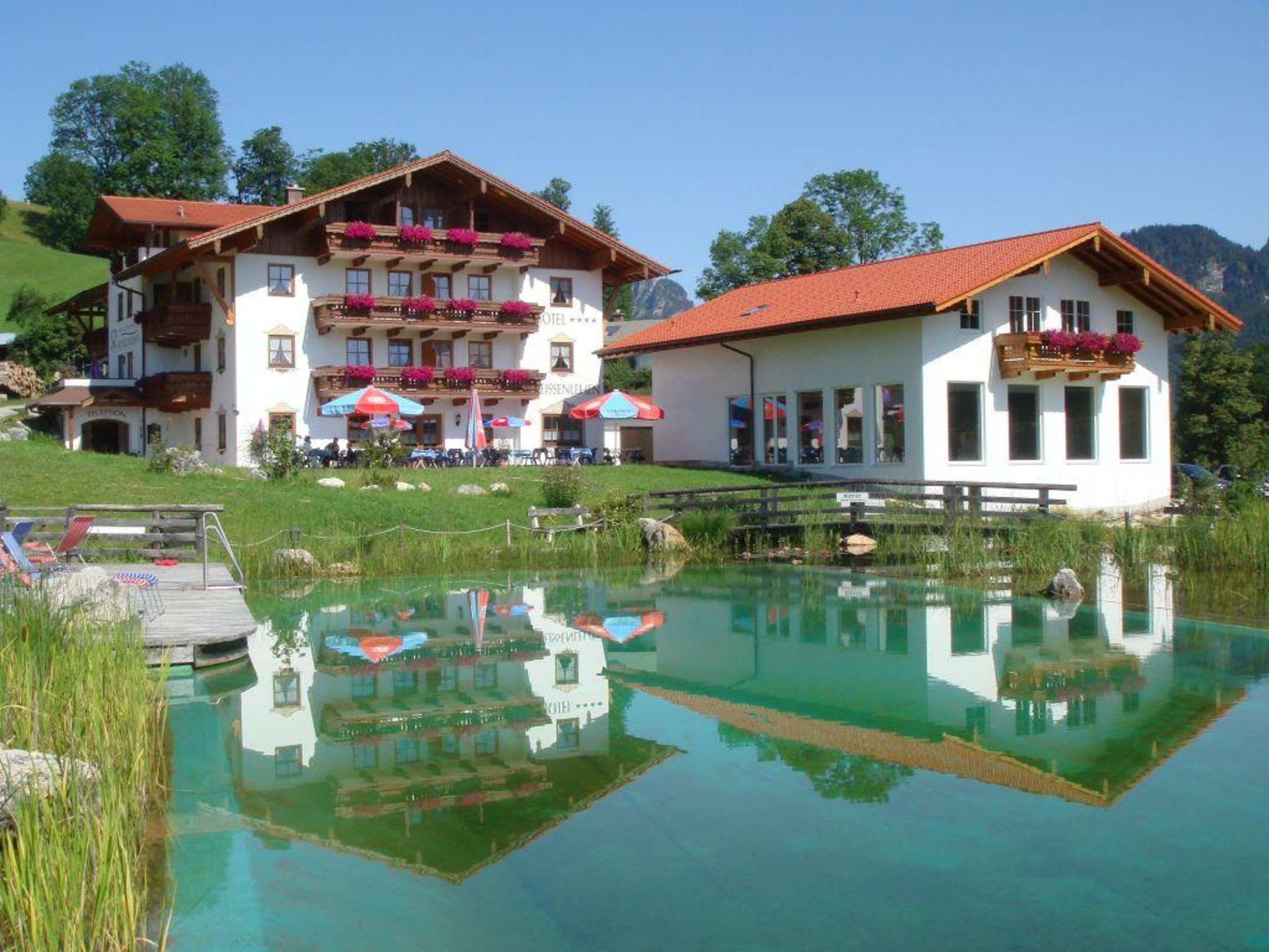 Ansicht des Hotels und des Wellness-Hauses mit Natur-Schwimmteich