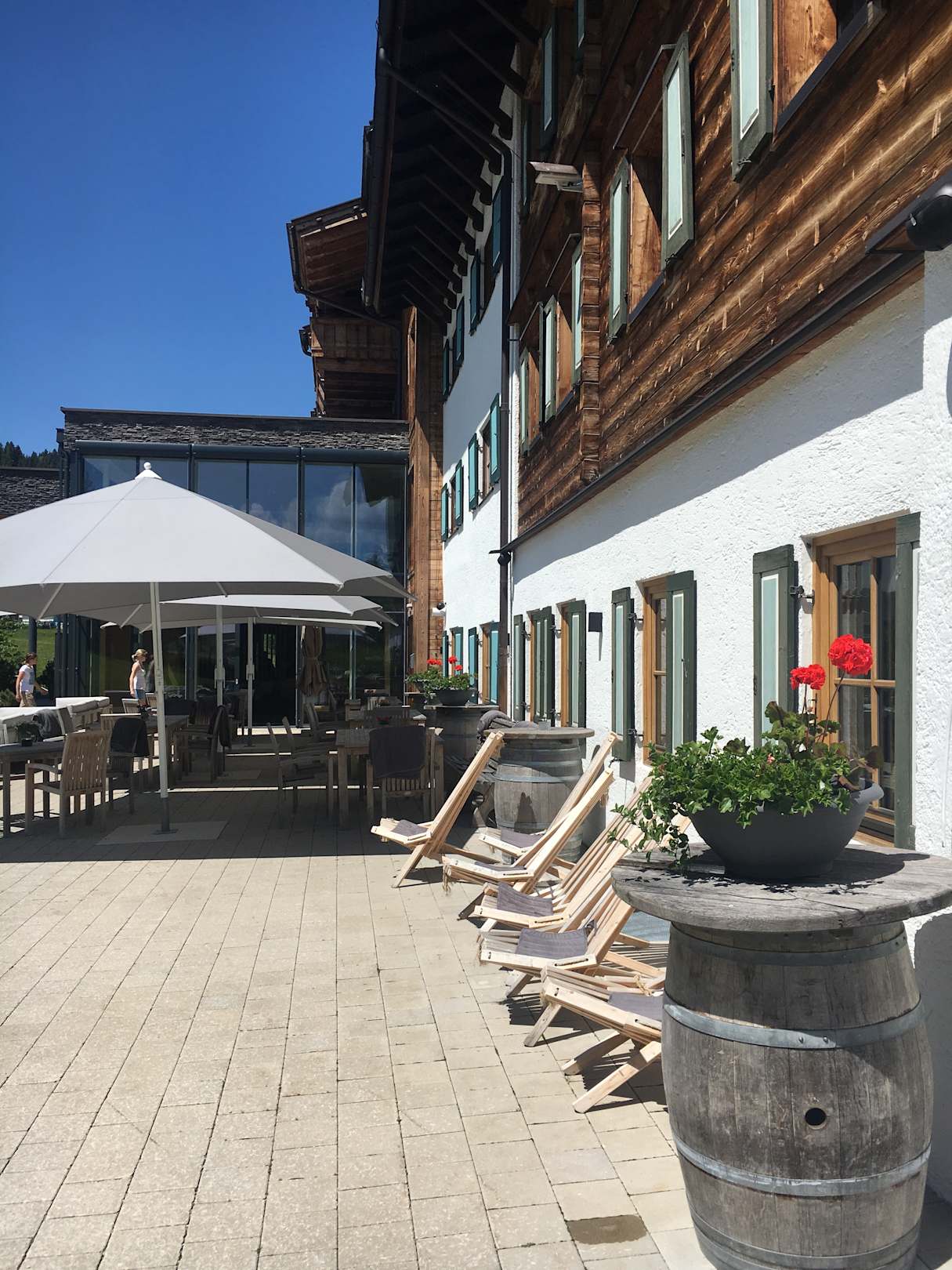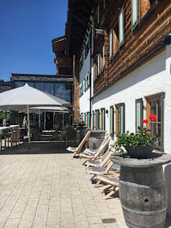 Schräger Blick auf den Eingangsbereich. Sonnenstühle.