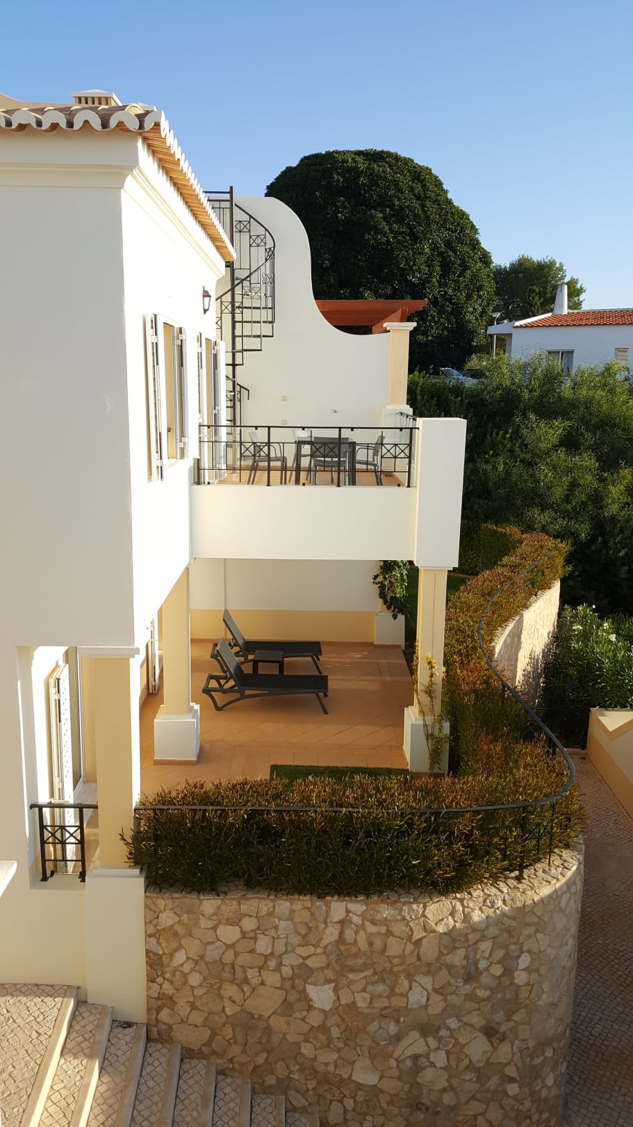Außenansichtunten Terasse, oben Balkon und mit dem Wendeltreppe geht es noch auf die Dachterasse.