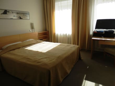 Bett im geräumigen Zimmer mit viel Ablagefläche