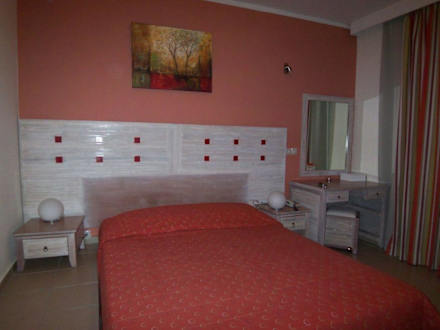 Im Zimmer gibt es eine große Stufe; hier zu erkennen direkt links neben dem Bett