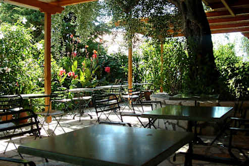 Frühstücksterrasse des NefeliMan kann IM Speisesaal, oder auch draussen das Frühstück und Abendessen einnehmen. Auf der Terasse ist es natürlich schöner. Morgens waren zu unserer Zeit allerdings seeeeehr viele Wespen unterwegs. Das kann natürlich stören und ist sicher nicht für jeden gut erträglich. Drinnen hielt sich das aber im normalem Rahmen.
