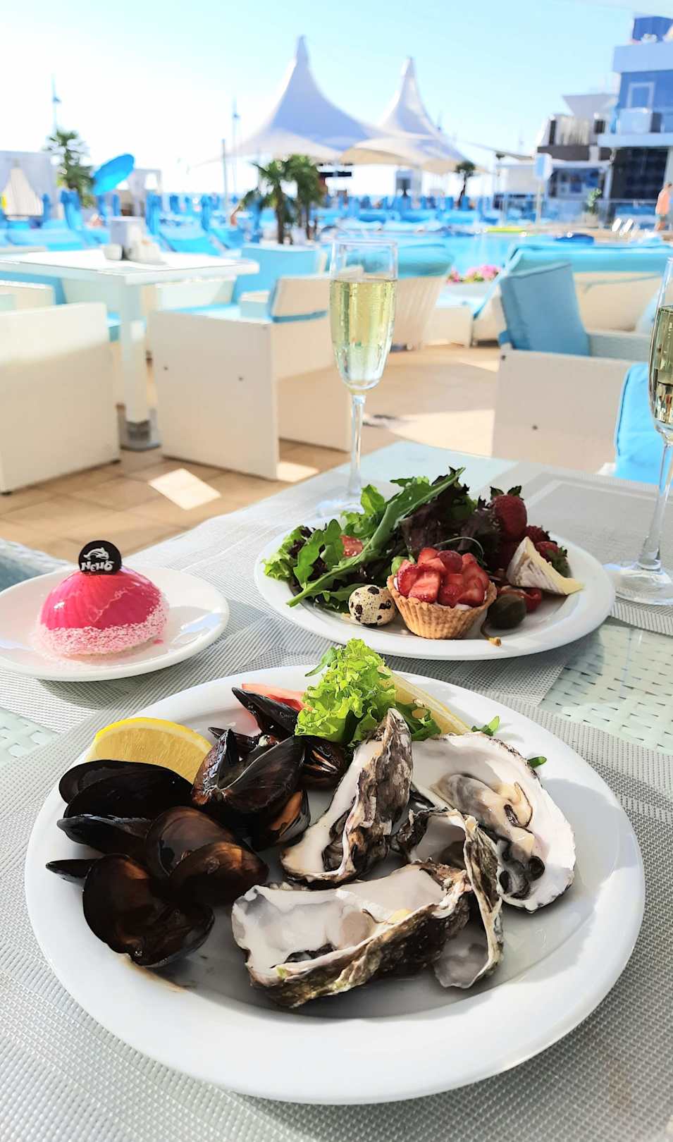 So muss das Frühstück in einem Hotel mit fünf Sternen aussehen. Törtchen, Austern und Champagner...