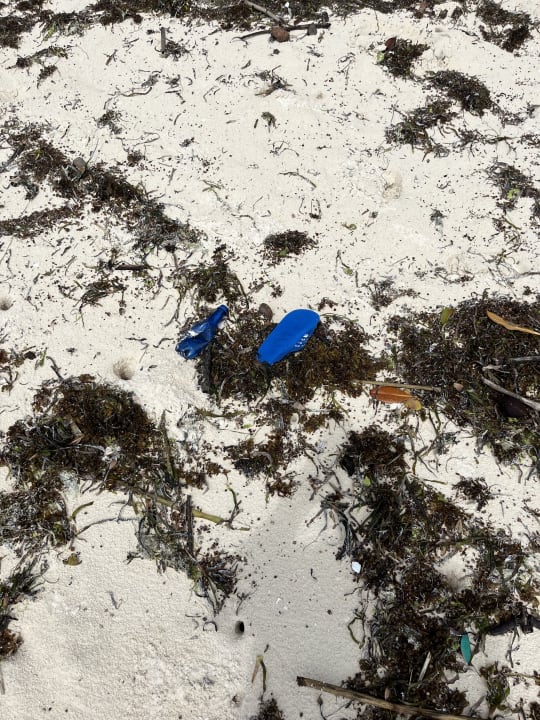 Der Strand ist mit Seegras übersäht und mit Müll bedeckt.