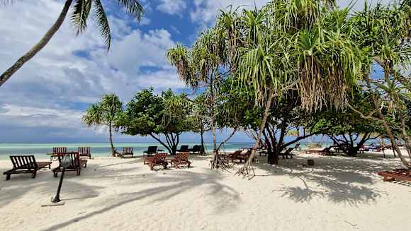 Liegen stehen unter Palmen, Auflagen werden gebracht, Schirme gibt es nur am Pool