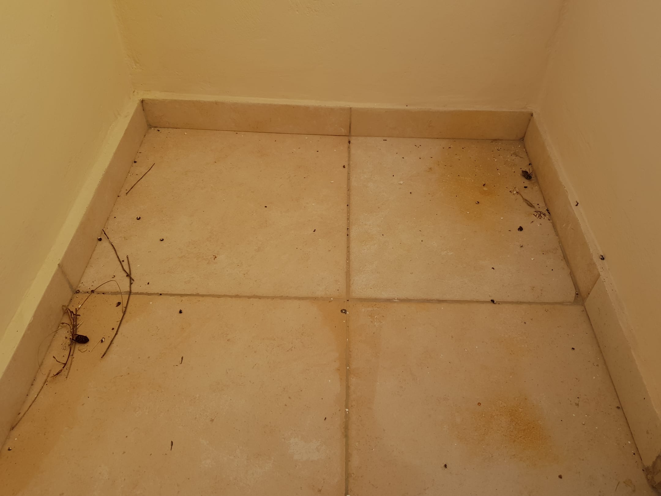 Balkon mit Dreck und Tieren.