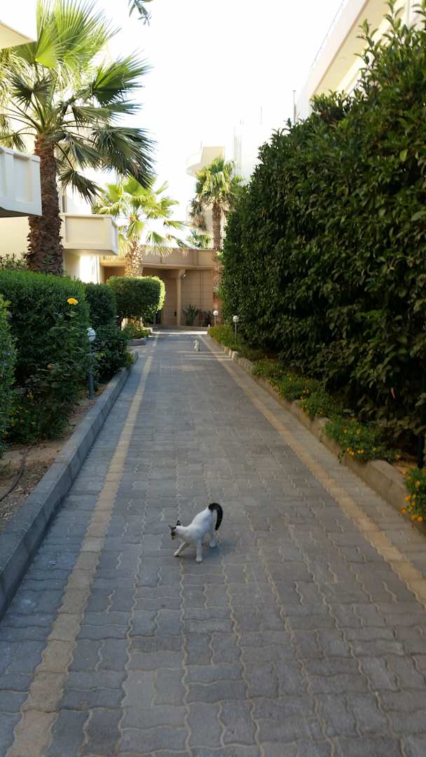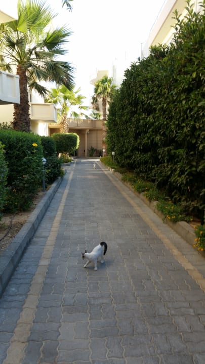 Außen im Hotelbereich viele Katzen.