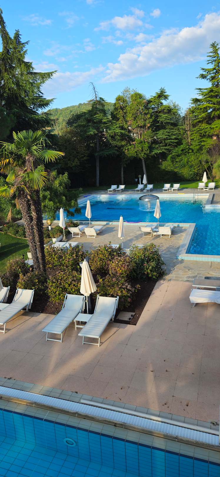 Hinten im Bild, warmes, mit verschiedenen Düsen ausgestatteter Thermapool