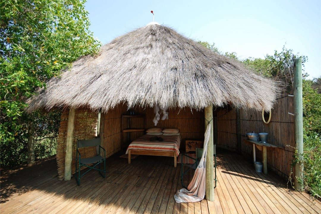 Veranda mit Hängematte, dahinter Schlafzimmer, rechts Waschbecken, dazwischen Durchgang zu Toilette und Dusche.