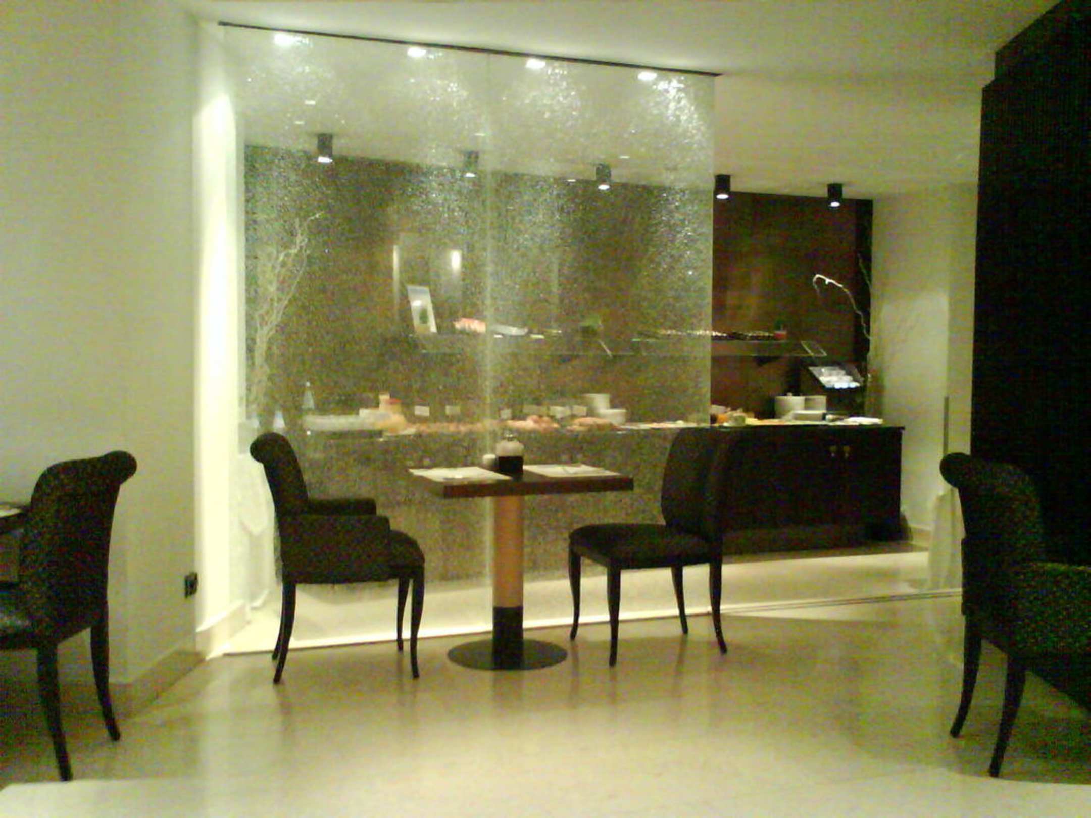 Das RestaurantEine "künstlich gesplitterte" Glaswand als Abtrennung zwischen Sitz- und Büffetbereich.