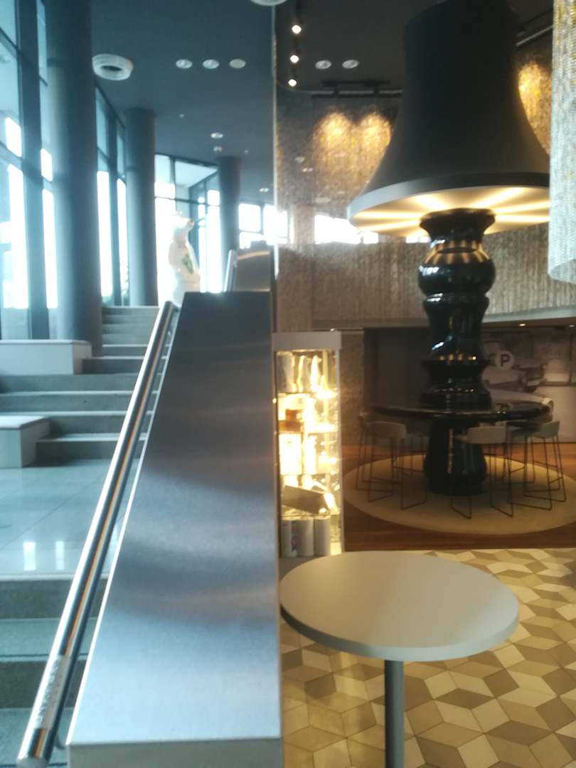 BLick von der Lobby zum Frühstücksraum und Terasse im 1. Stock