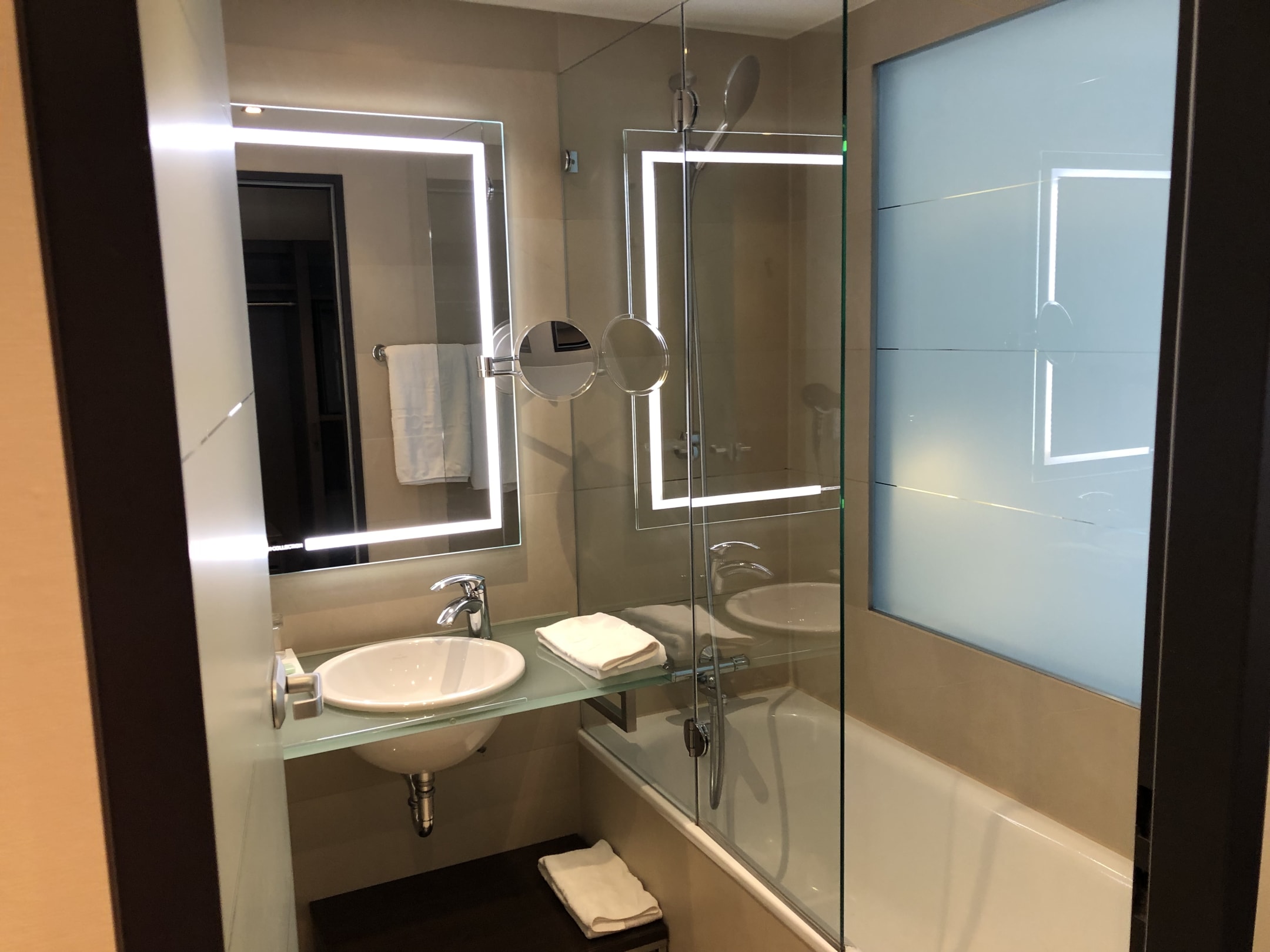 Badezimmer mit Milchglas an der Dusche zum Zimmer gerichtet