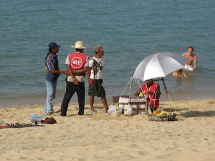 Strandverkäuferhier sollte man Papaya Salat, Maiskolben oder Hähnchenspieße probieren