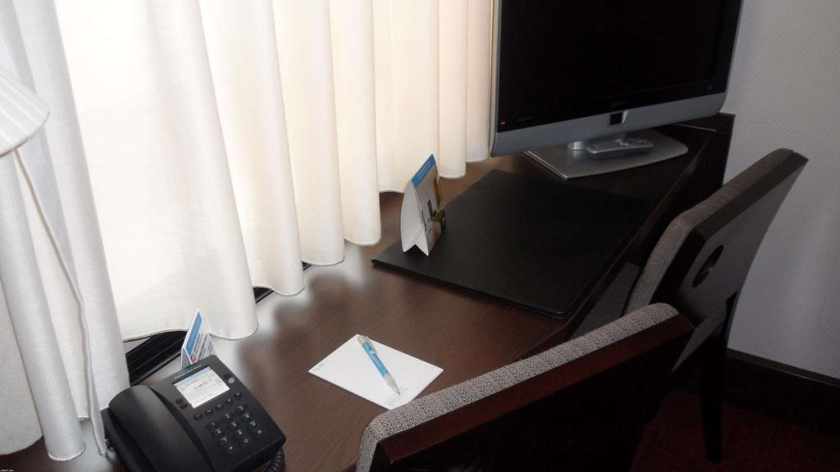 Zimmer 314, Schreibtischbereich mit TVSchreibtischbereich mit Flachbild-TV und Telefon vor dem Fenser, davor 2 Stühle