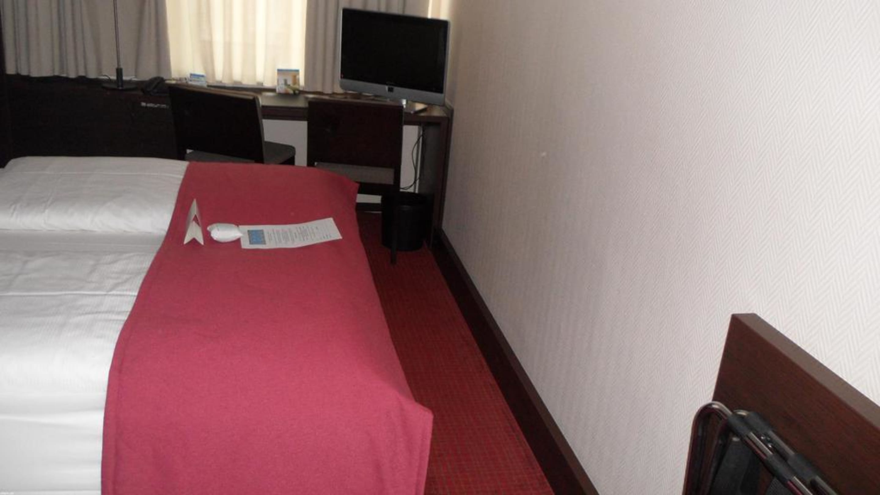Zimmer 314Blick ins Zimmer; vorn rechts Kofferablage, links das Doppelbett - sehr eng der Zugang ums Bett - vor Schreibtischbereich mit 2 Stühlen