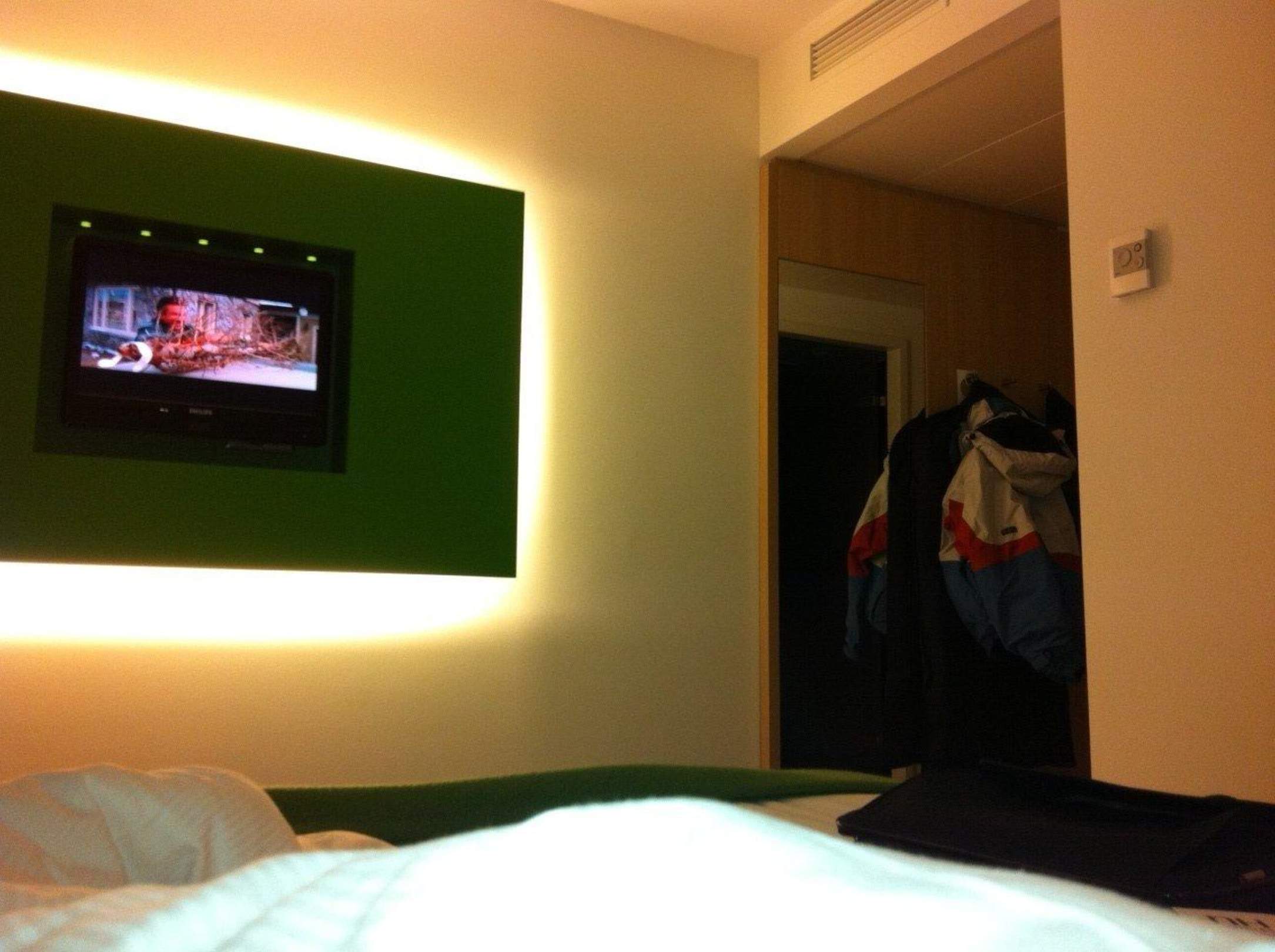 Blick vom Bett auf TV und Garderobe