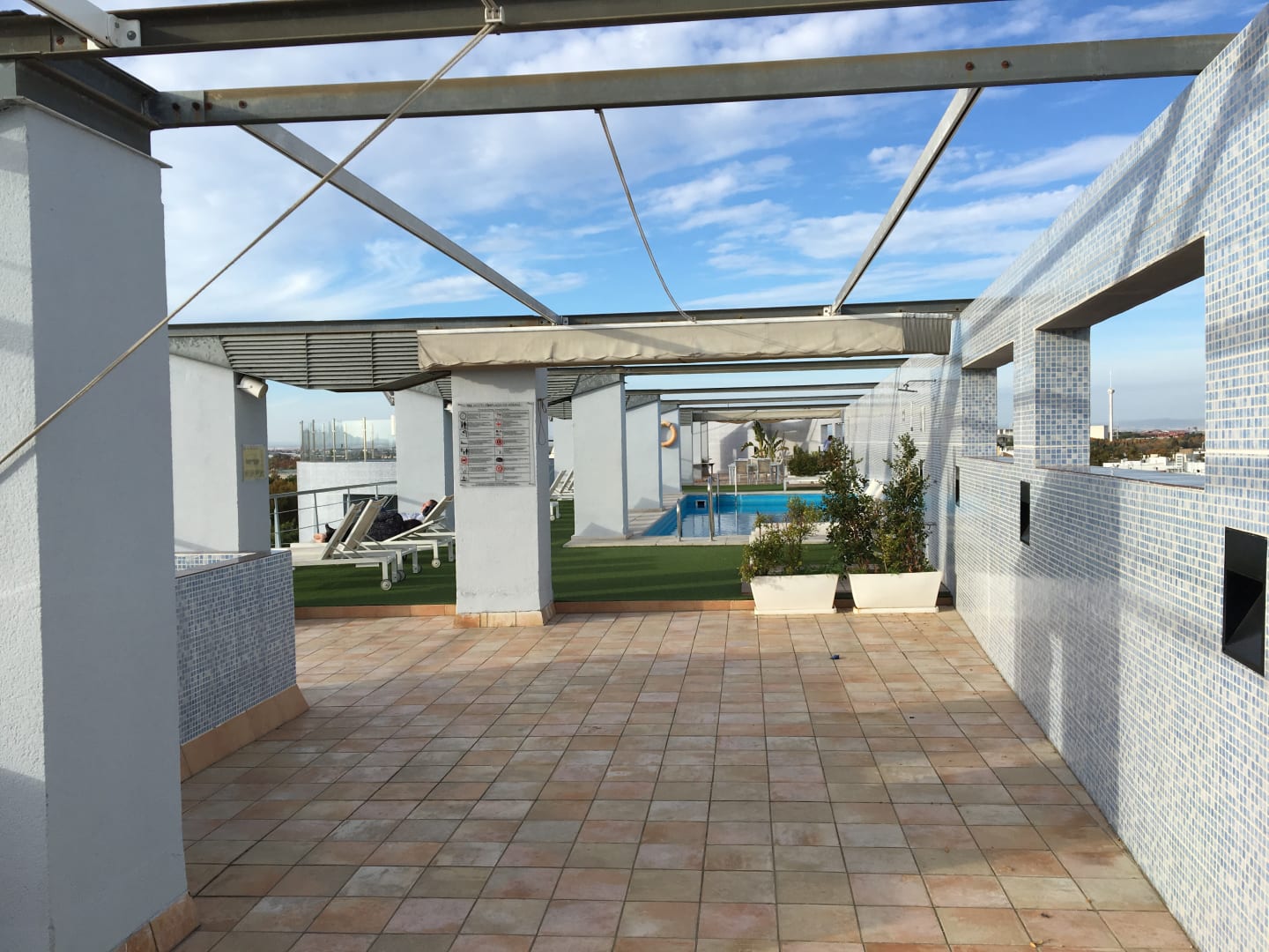 Pool auf oberer Ebene der Dachterasse mit Sonnenliegen