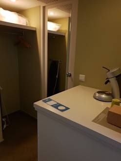 Einzige Aufbewahrungsmöglichkeit für Kleidung (!). Im Schrank vorne ist der Kühlschrank.