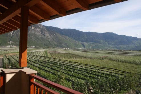 Blick vom Balkon der Ferienwohnung auf die blühenden Apfelbäume.