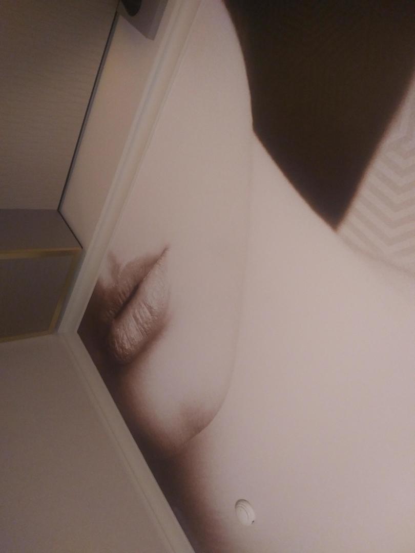 Der Blick auf die Zimmerdecke, wenn man die Augen öfnet. Ein riesiges 1/4 Frauengesichtsfoto.