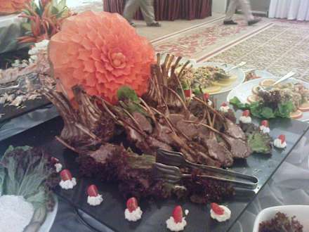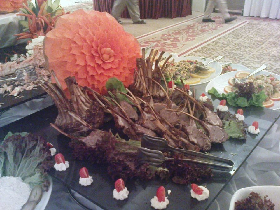 Abendbüffetschmackhafte Lammkoteletts, schön garniert.