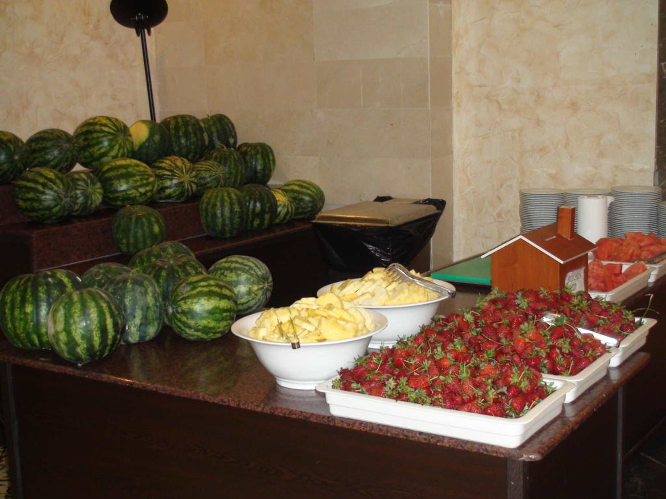 Frische Erdbeeren, Melonen und AnanasDie Melonen und Anannas werden bei Bedarf frisch vom Koch zugeschnitten.