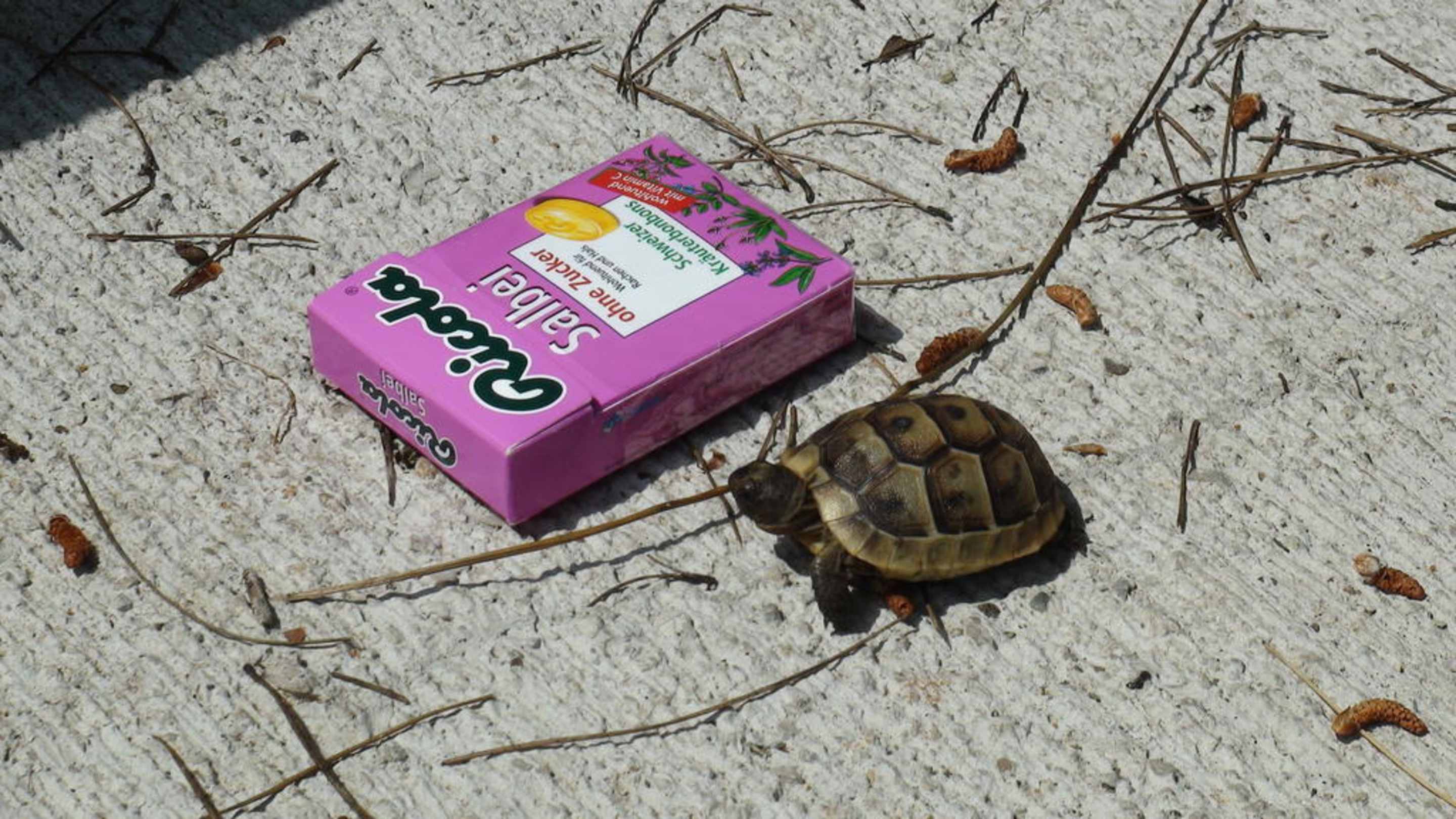 Minischildkröte auf dem HotelgeländeDie Schachtel dient nur zum Größenvergleich