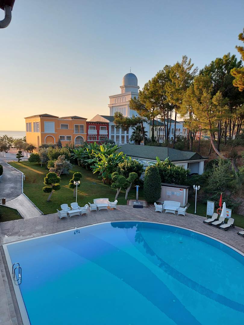 seitlicher Ausblick vom Zimmer zum Pool, Wald und Meer
