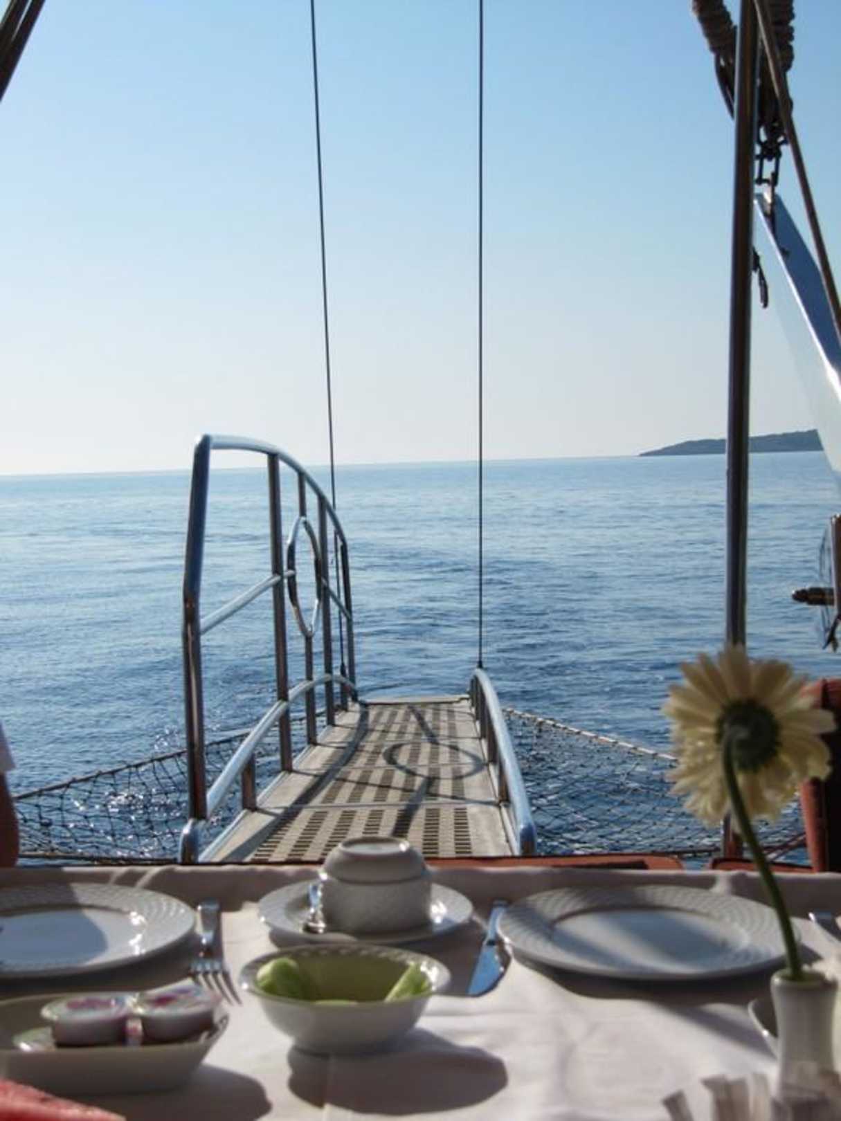 Das Yacht Frühstück (inkl. Badetour) findet jeden Tag von 8 Uhr bis 10 Uhr statt. Auf dem Schiff gibt es neben einem kontinentalen Frühstück auch frisch zubereitete Omelette sowie Sekt und Obst.