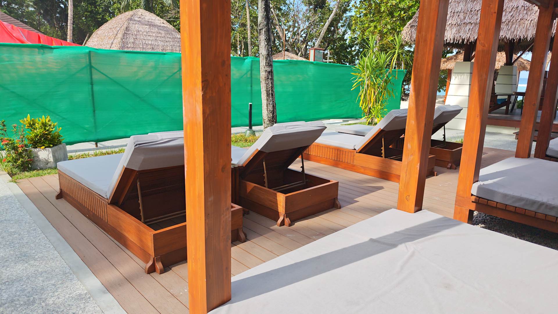 Poolliegen mit Blick auf den geschlossenen Pool