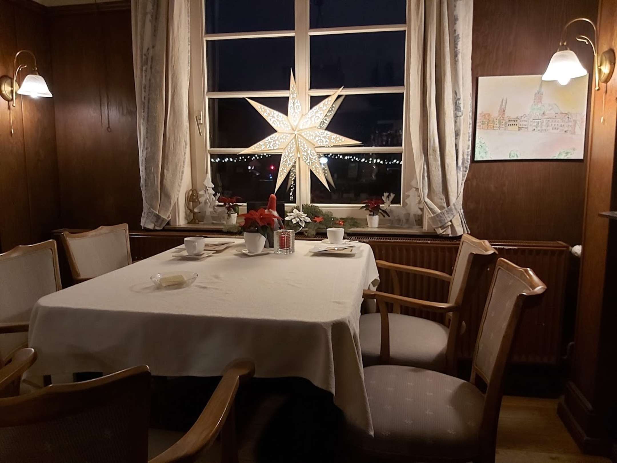 Netz geschmückt mit Ausblick auf die Weihnachtsbeleuchtung im Garten