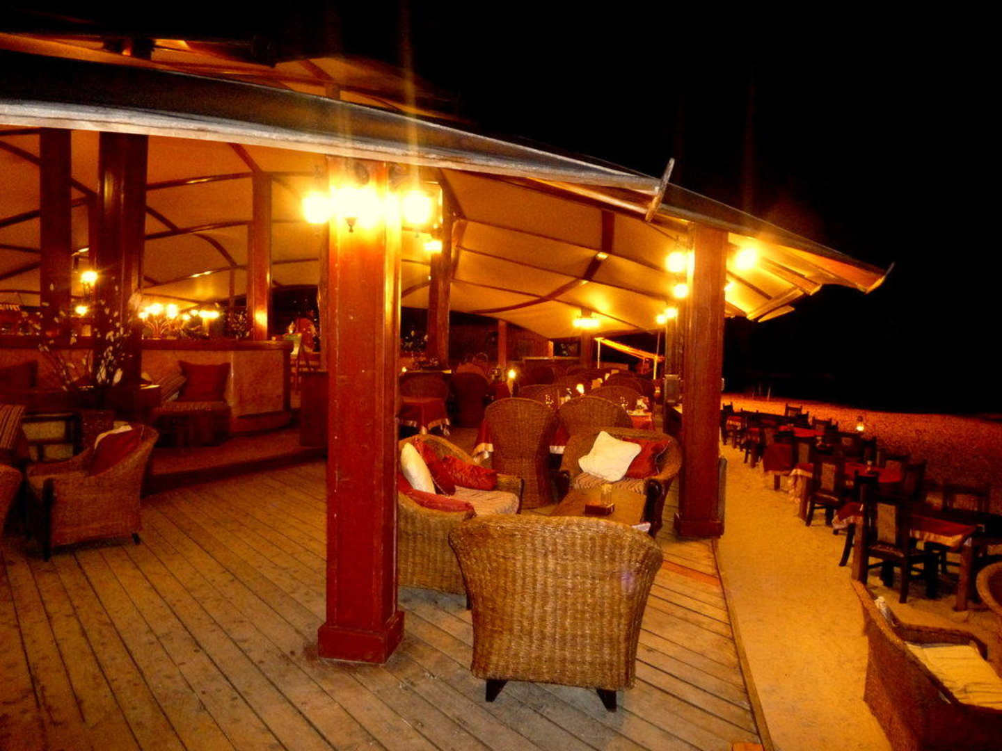Teil des HotelrestaurantsHotelrestaurant mit Blick auf den Strand und das Meer.