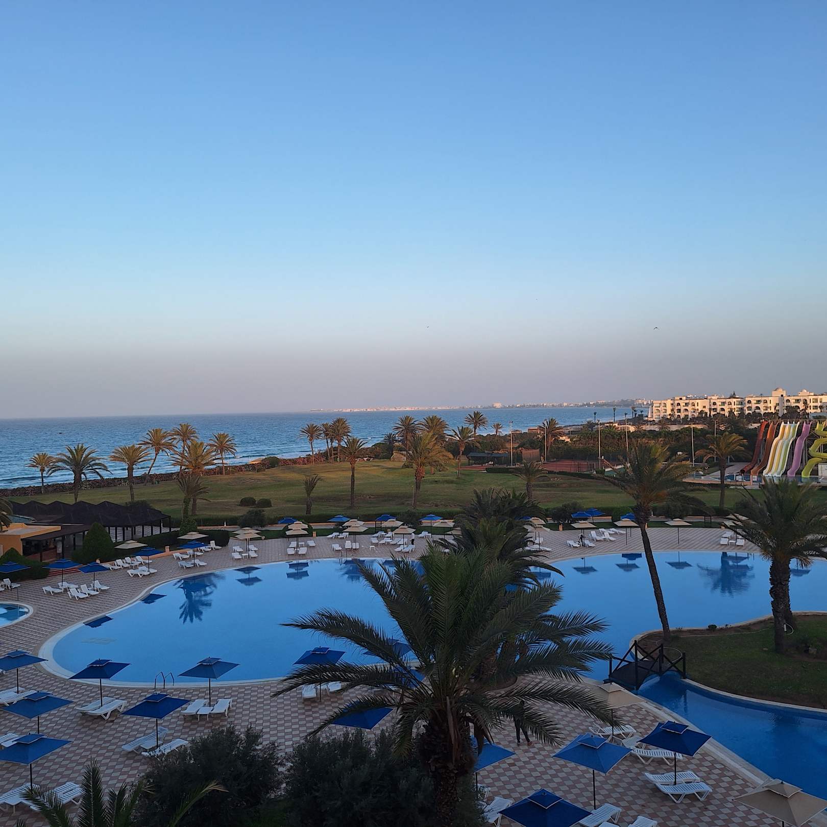 Abendaufnahme vom Balkon auf das Meehr und das Pool 04.06.3035