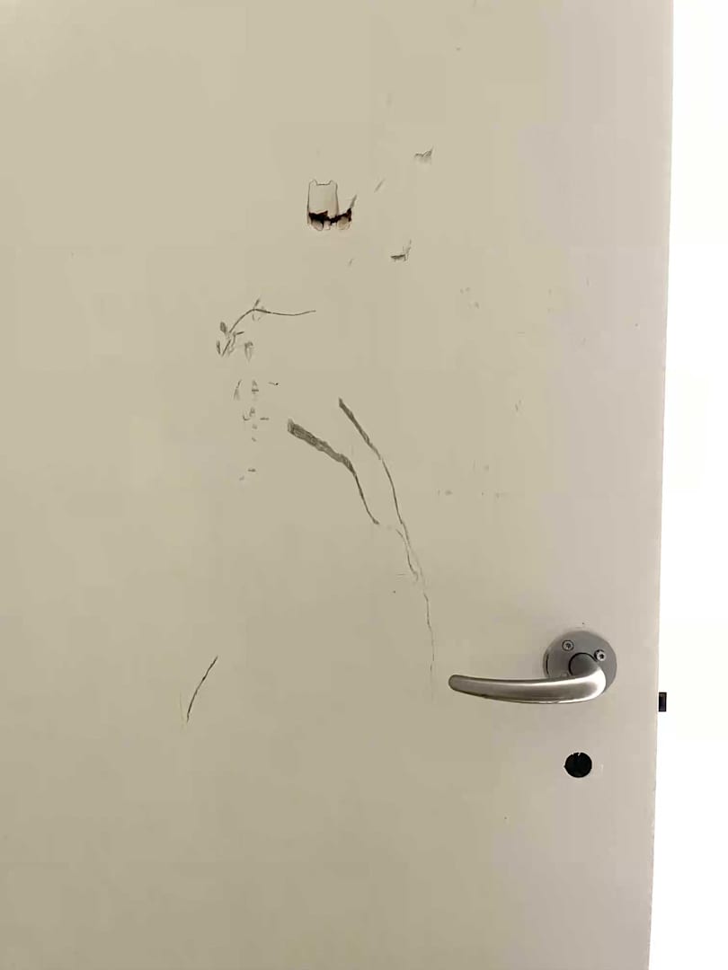 Eine der beschädigten Innentüren, an denen ein Vormieter seine Wut ausgelassen hat.