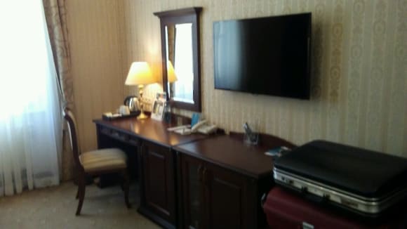 Schreibtisch, TV und Minibar (unter dem Fernseher) im Wohnzimmer der Junior Suite