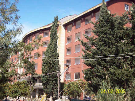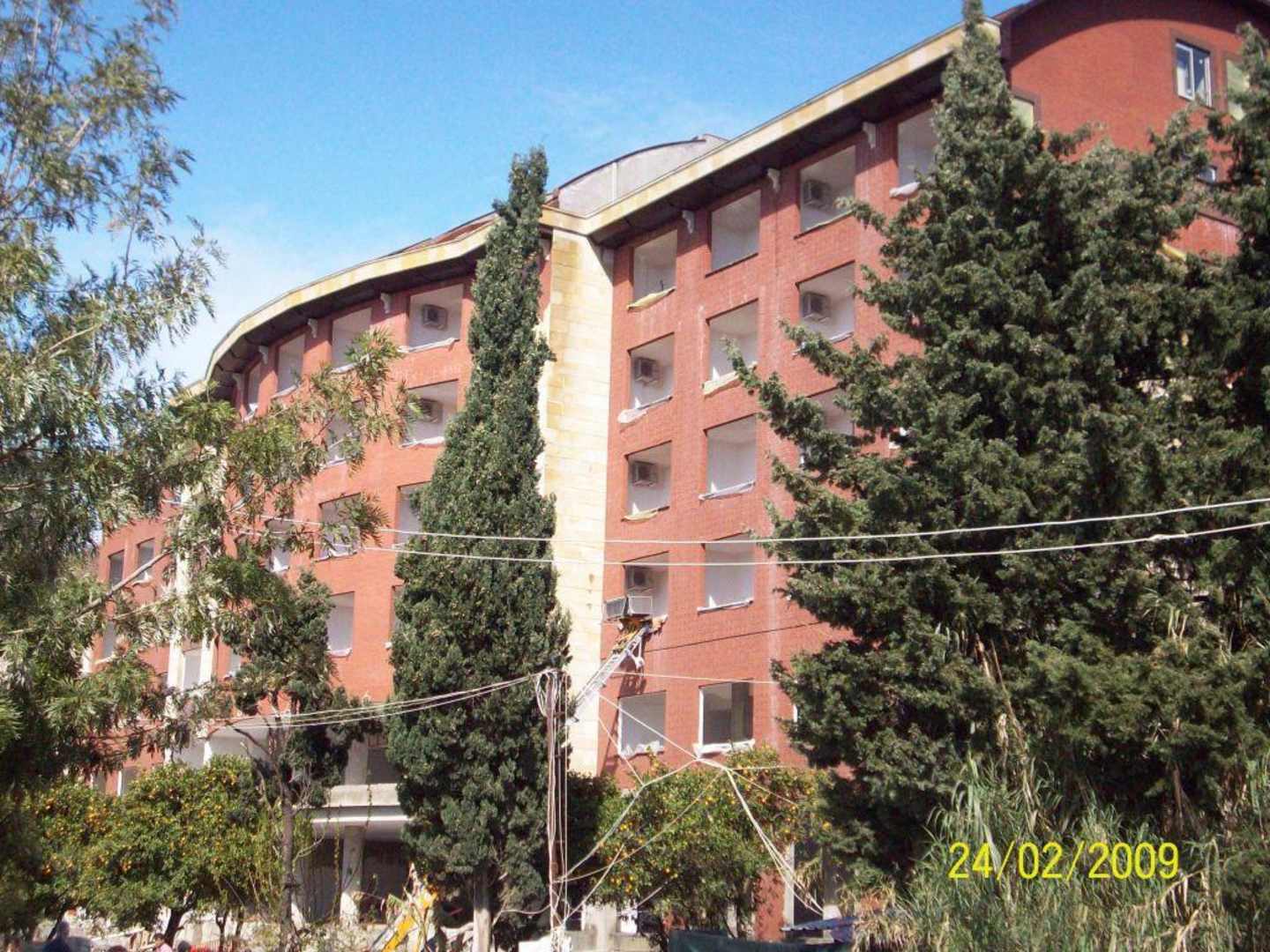 Schön, dass vor dem Gebäude die Bäume stehen geblieben sind. Fenster sind eingesetzt; Klimaanlagen montiert.