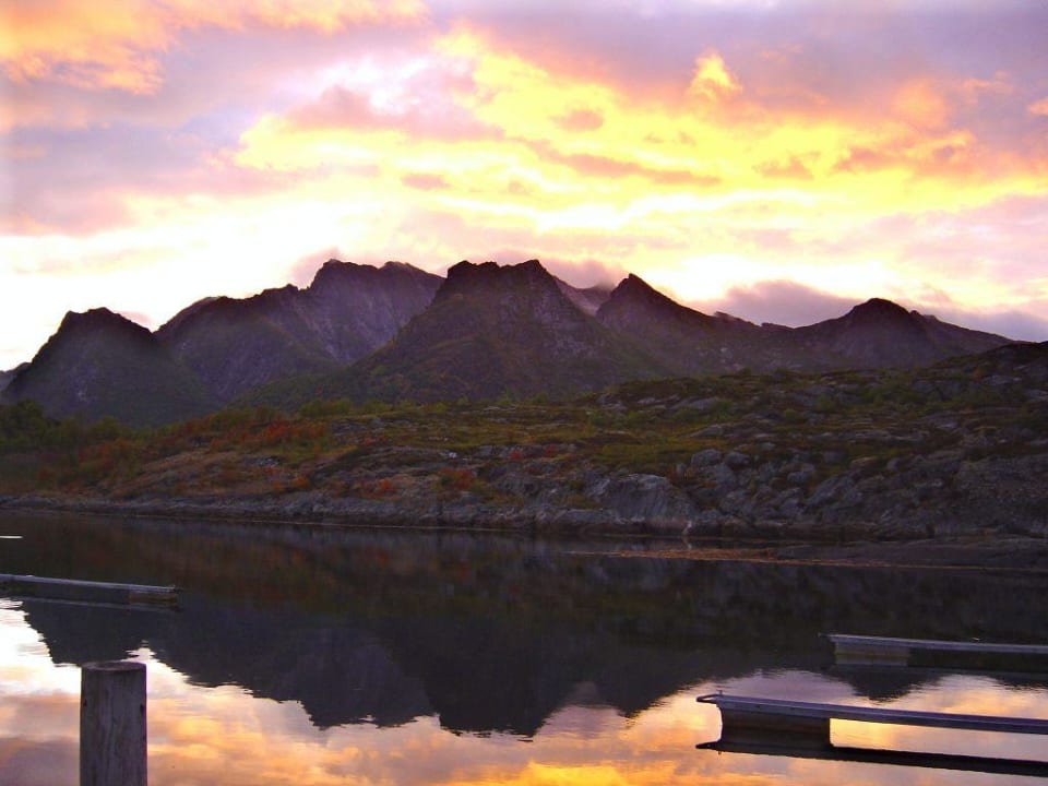 Sonnenuntergang über den FjordSonnenuntergang über den Fjord von der Rorbue-Terrasse aus gesehen