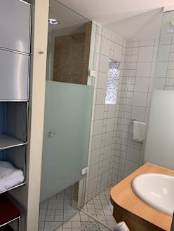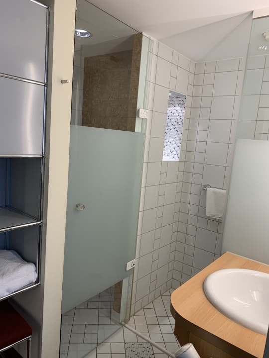 Zimmerlinks Toilette, Türe wird einmal zur anderen Seite aufgemacht, dann ist es die Türe der Dusche. Keine weitere Badezimmertüre vorhanden.