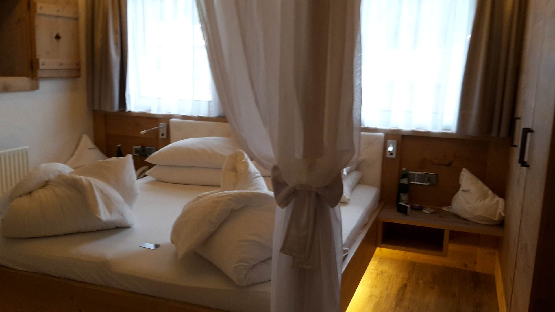 Himmelbett und beleuchteter Schrank rechts