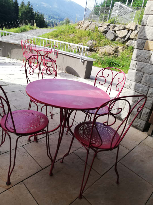 Hier ist ein kleiner Teil der großen Terrasse mit unterschiedlichen Sitzmöglichkeiten. Es gibt auch noch Bänke und eine Sofaecke. Eine Grillecke ist ebenfalls vorhanden.