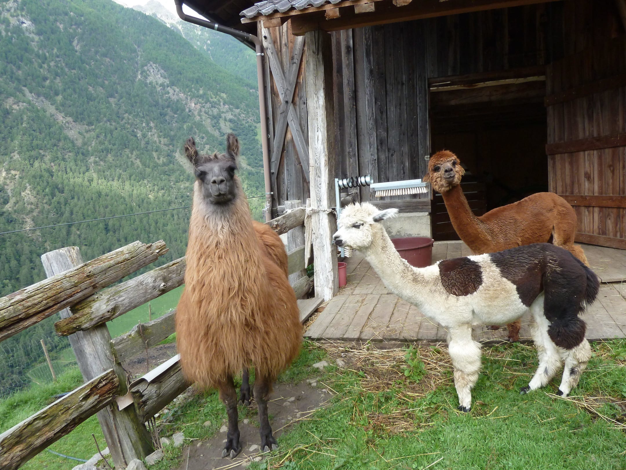 eines von den vier Lamas mit den beiden Alpakas - sehr liebe Tiere