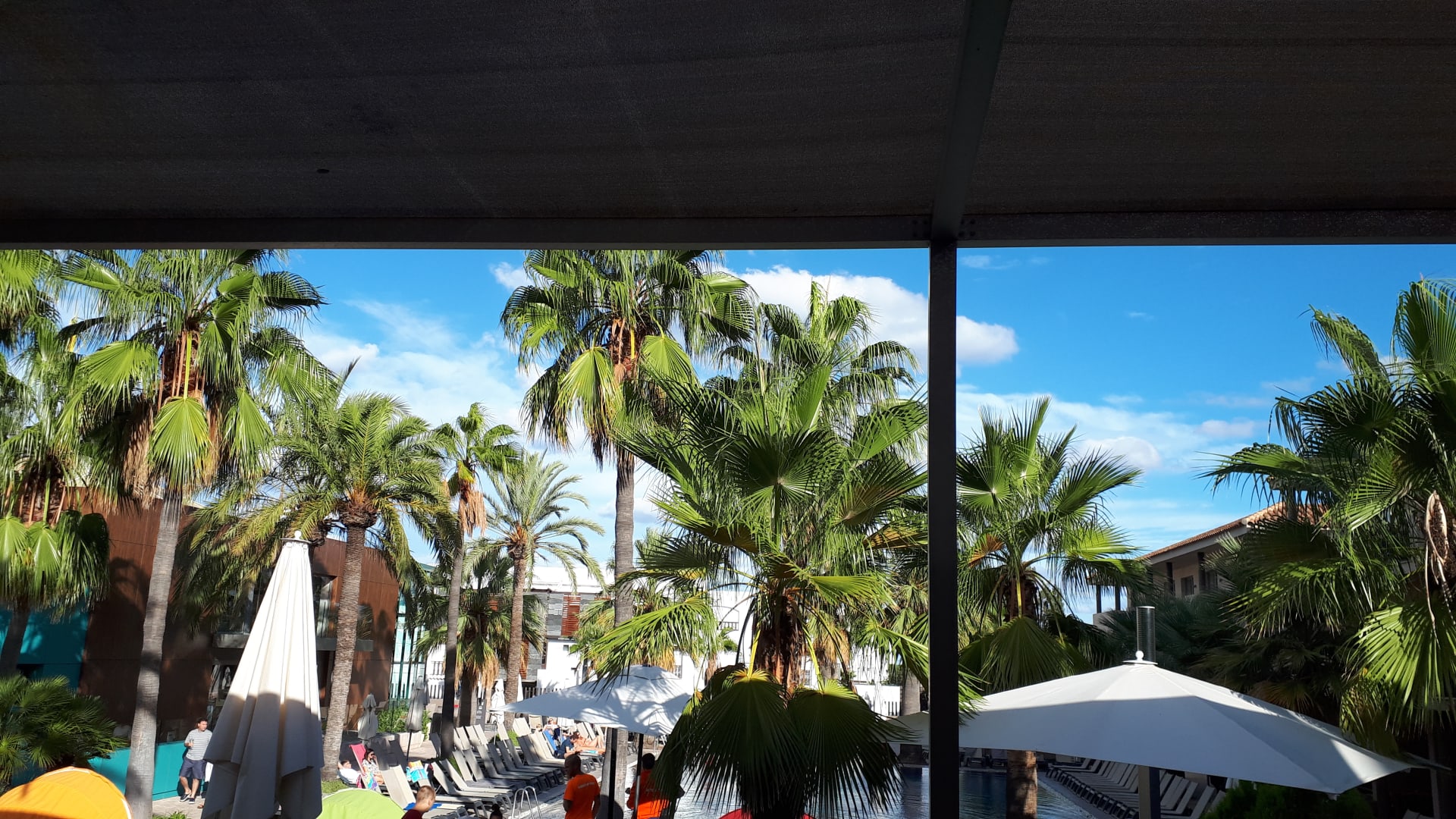 Blick von der Restaurantterrasse in die Poolanlage