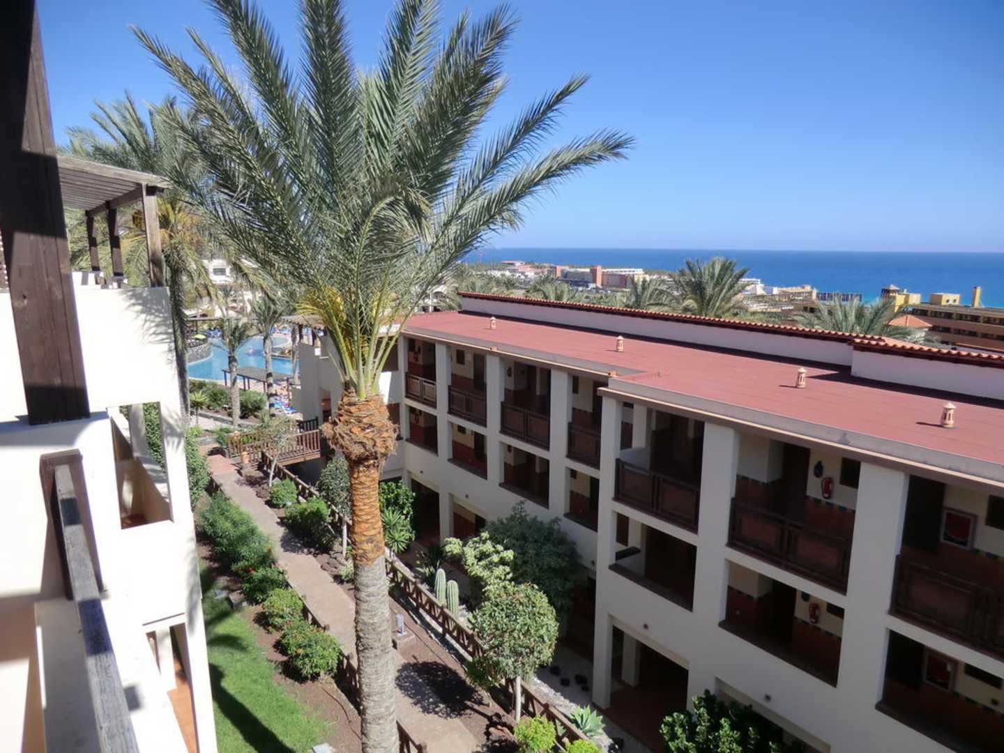 Blick vom BalkonPool und der tiefer liegende Gebäudekomplex
